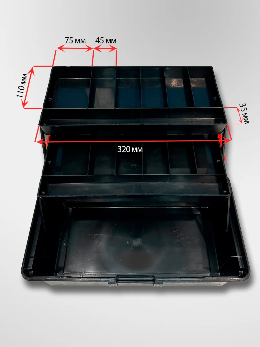 Ящик открывается благодаря ступенчатой раздвижной системе, его крышка служит опорой. В крышку встроены три отдела для мелких рыболовных принадлежностей, которые расположены под прозрачной, плотно защелкивающейся крышкой, что позволяет не открывая короб, быстро оценить содержимое этих отделов и выбрать нужную мелочевку. Органайзер содержит 2 лотка и основное глубокое отделение, закрываются плотно, изолированы друг от друга, что полностью исключает возможность перемешивания и спутывания приманок, воблеры, блесна, средние рыбацкие снасти. В нижний сектор можно сложить необходимые инструменты, эхолот, фонарик, катушку с леской и другую комплектацию для личных нужд. Подойдет дома, в быту, в гараж для мелочей, которые требуют сортировки и хранения. Отличный подарок для папы, мужа рыбака, охотника, автослесаря.