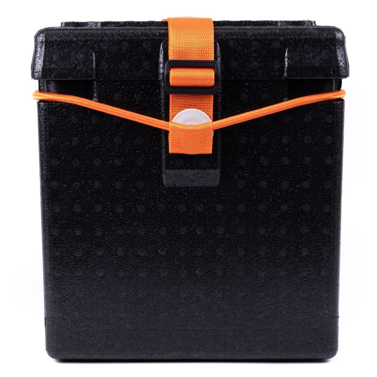 Модель оснащена системой креплений, расположенной по периметру. Это позволяет фиксировать крышку в открытом положении, закреплять полотенца или рукавицы, а также надежно удерживать ящик в волокушах во время транспортировки. Резинки для фиксации крепятся на наплечный ремень, что делает использование ящика еще удобнее.