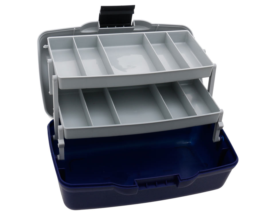 Двухполочный ящик для рыболовных снастей. Изготовлен из полипропилена, устойчив к воздействию масел, растворителей и силиконов. Блок из двух полочек имеет раскладную конструкцию. В транспортном положении полочки плотно прилегают друг к другу, не давая содержимому рассыпаться. Система фиксированных и съёмных перегородок позволяет формировать внутренние пространство по своему усмотрению. Основное отделение ящика не имеет перегородок и предназначено для хранения крупных предметов. Оснащен плотной крышкой, которая крепиться с помощью шарнирного соединения, закрывается на замок-защелку. Подходит для транспортировки и хранения любых приманок.