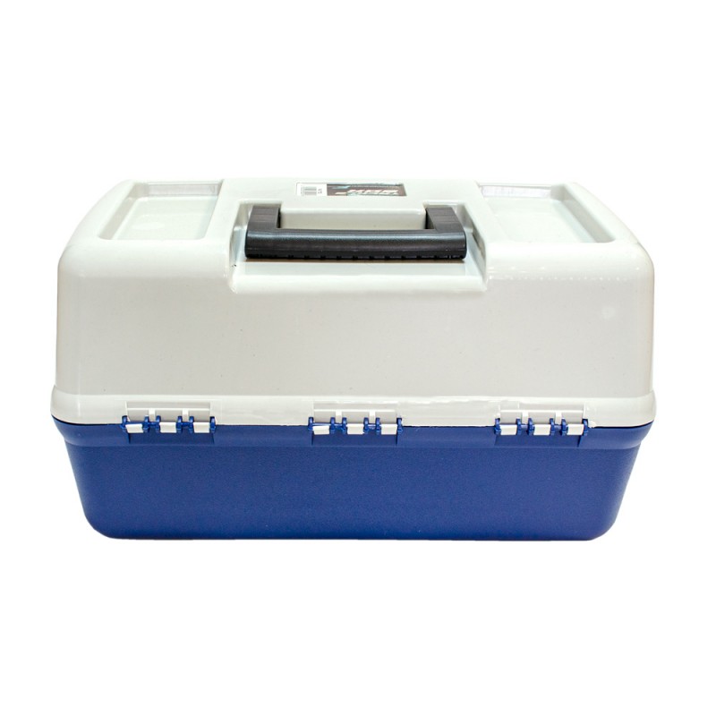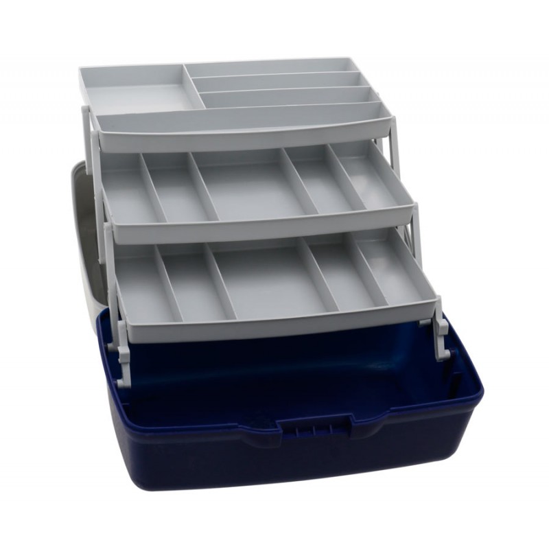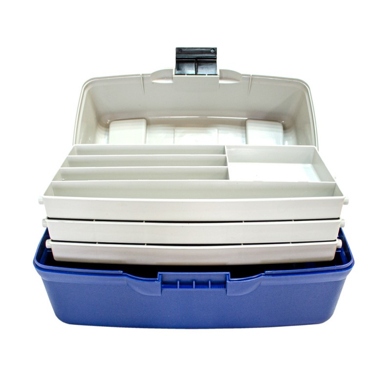 Трёхполочный ящик для рыболовных снастей. Изготовлен из полипропилена, устойчив к воздействию масел, растворителей и силиконов. Блок из трёх полочек имеет раскладную конструкцию. В транспортном положении полочки плотно прилегают друг к другу, не давая содержимому рассыпаться. Система фиксированных и съёмных перегородок позволяет формировать внутренние пространство по своему усмотрению. Основное отделение ящика не имеет перегородок и предназначено для хранения крупных предметов. Оснащен плотной крышкой, которая крепиться с помощью шарнирного соединения, закрывается на замок-защелку. Подходит для транспортировки и хранения любых приманок.
