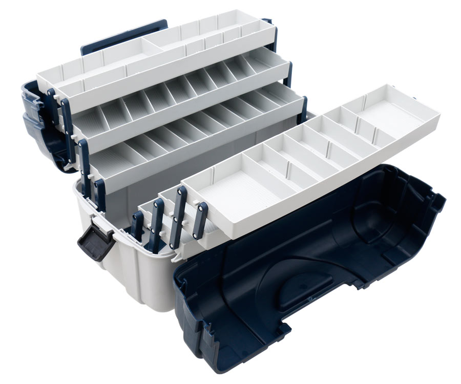 Шестиполочный ящик для рыболовных снастей. Изготовлен из полипропилена, устойчив к воздействию масел, растворителей и силиконов. Блок из шести полочек имеет раскладную двухстороннюю конструкцию. В транспортном положении полочки плотно прилегают друг к другу, не давая содержимому рассыпаться. Верхние отсеки делятся ещё на несколько с помощью 16 съёмных перегородок. Система фиксированных и съёмных перегородок позволяет формировать внутренние пространство по своему усмотрению. Основное отделение ящика не имеет перегородок и предназначено для хранения крупных предметов. Ящик оснащен плотной крышкой, которая крепиться с помощью шарнирного соединения, и открывается на две стороны, закрывается на замки-защелки, которые расположены по бокам ящика. Подходит для транспортировки и хранения любых приманок. Обладает вертикальной прочностью не менее 90 кг.