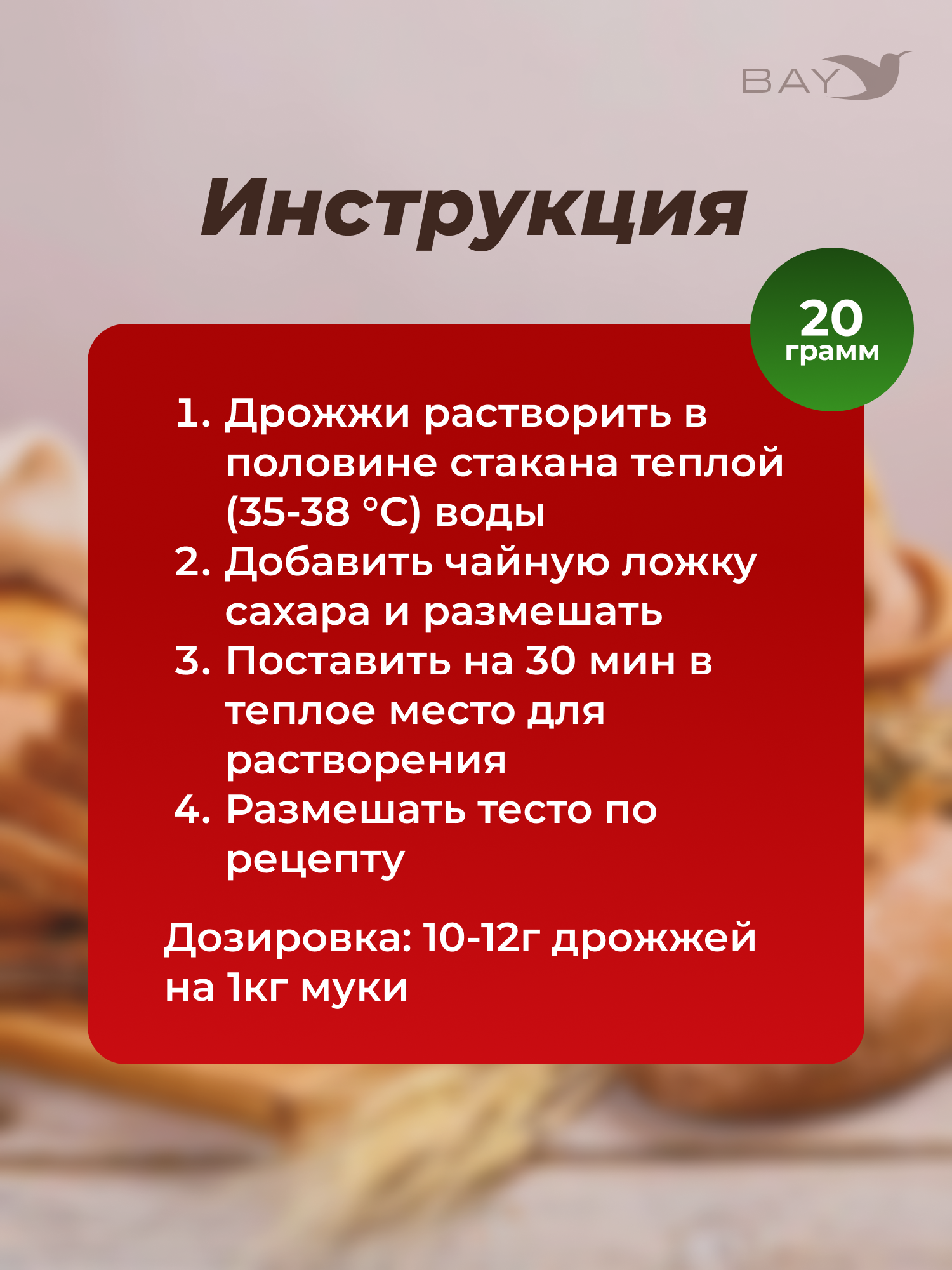Срок годности дрожжей - 14 месяцев при температуре от +5 °C до +15 °C. Удобный формат 20 г - идеальный выбор для единичного приготовления, что исключает необходимость долгого хранения вскрытой упаковки.