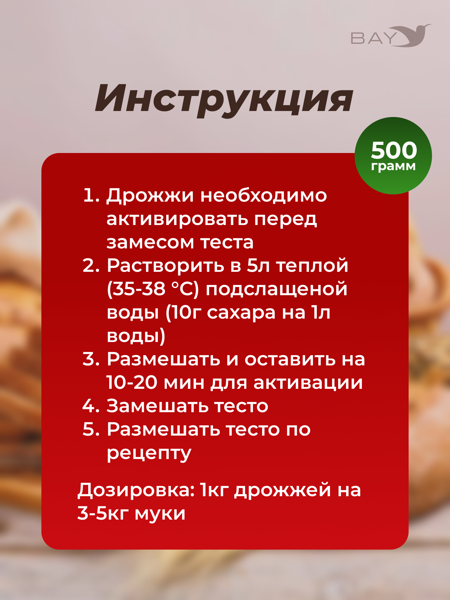 - Легкость в использовании: Для активации просто растворите дрожжи в теплой воде или молоке (35º-38ºС), добавьте чайную ложку сахара, и спустя 30 минут они будут готовы к замесу теста. Оптимальная дозировка – 10-12 г дрожжей на 1 кг муки.
