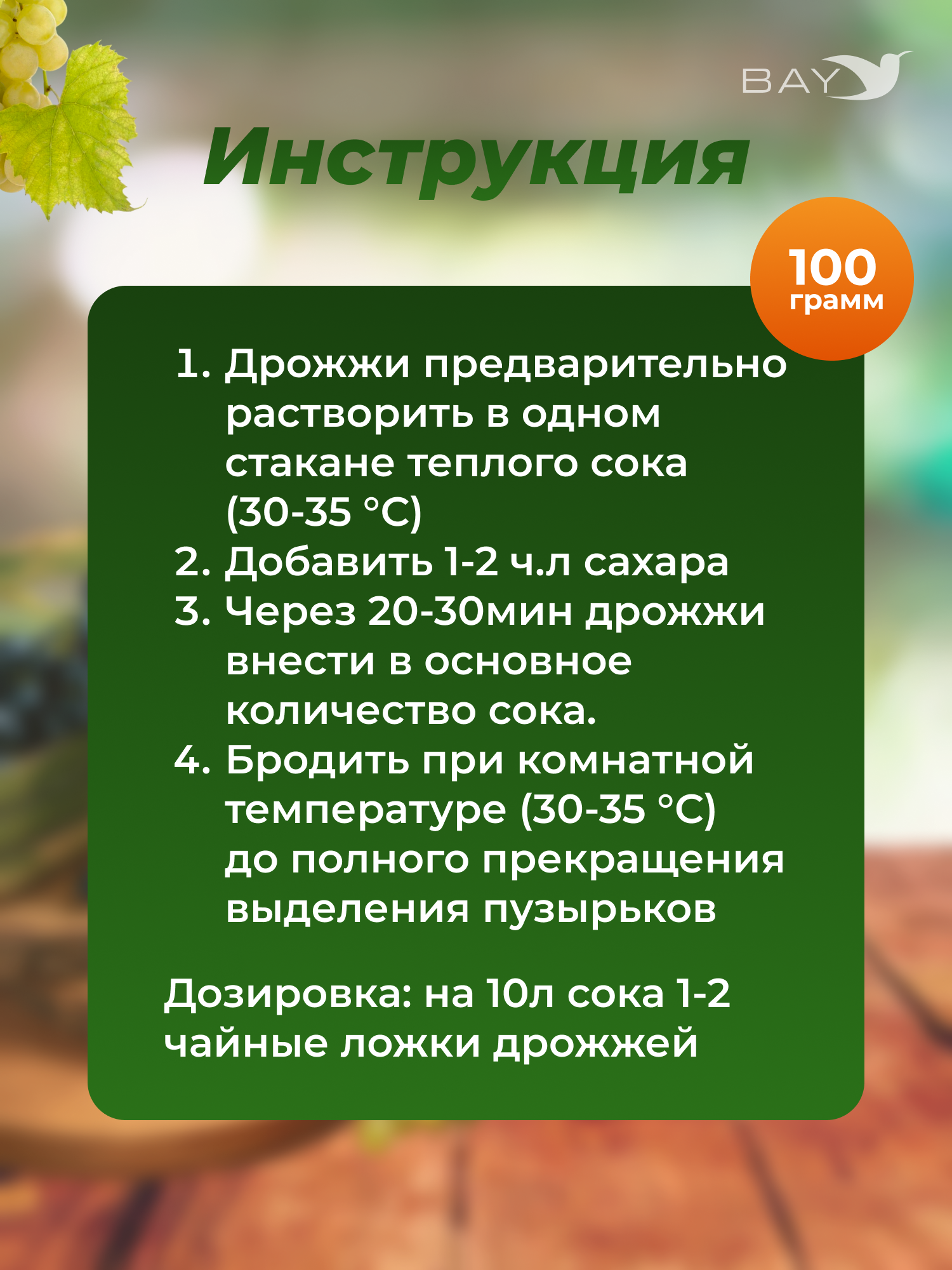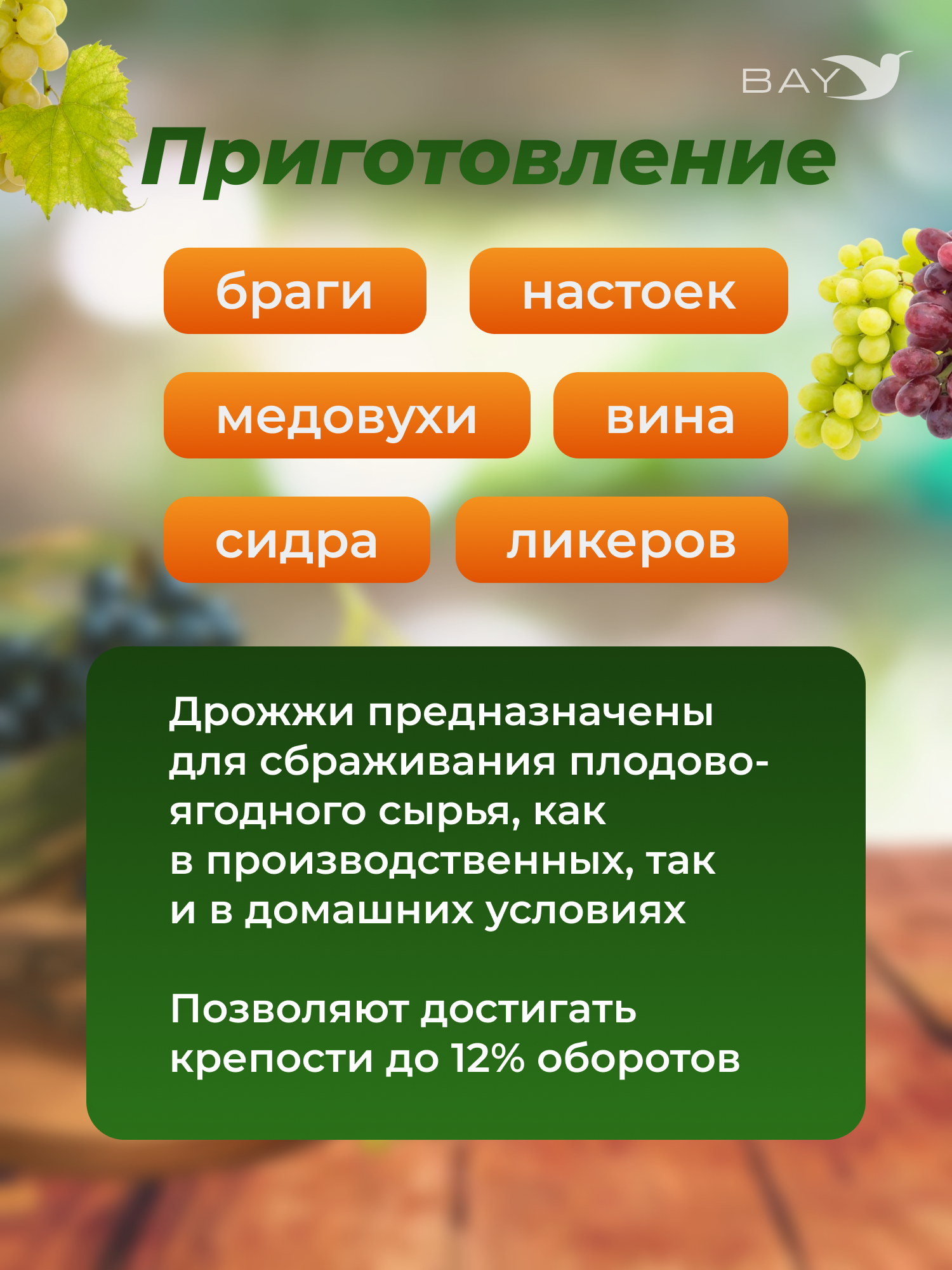 Применение: Идеальны для сбраживания плодово-ягодного сырья при производстве вина, настоек, ликеров и других напитков как в домашних условиях, так и на производственных мощностях. Дрожжи легко активируются: достаточно развести их в тёплой воде с сахаром и через 30 минут они готовы к использованию.