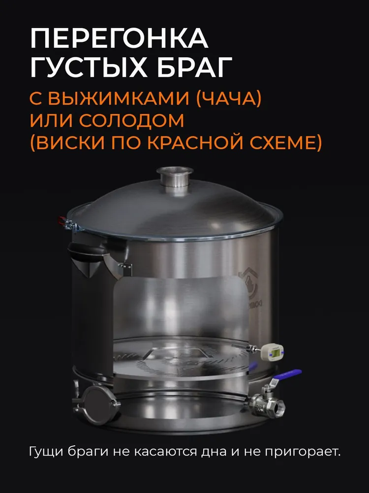 - Перегонка густых браг. Гуща, содержащая выжимки фруктов (например, для чачи) или зерновую основу (для виски), не касается дна куба, что исключает пригорание.