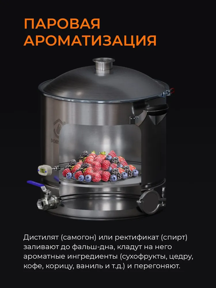 - Паровая ароматизация. Дистиллят, проходя через ингредиенты, размещённые на фальшдне (цедра, специи, сухофрукты), насыщается их ароматом, создавая сложные вкусовые композиции.