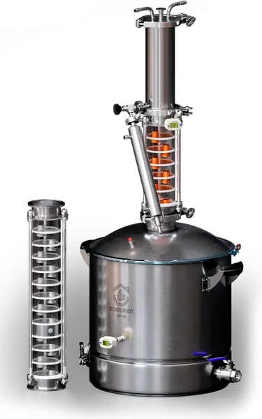 Бытовой дистиллятор Domspirt 2 - современная колонная система для получения крепких и ароматных напитков в домашних условиях. Аппарат оснащен царгой с 18 тарелками, из которых 12 выполнены из нержавеющей стали и 6 из меди, что обеспечивает эффективную очистку спиртовых паров и улучшение вкусоароматических характеристик продукта. Встроенный ТЭН мощностью 3 КВт позволяет работать без внешнего источника нагрева, делая процесс перегонки максимально удобным и стабильным.