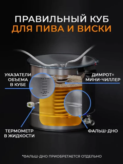 - Перегонный куб 37 л (Ёмкость, Купольная крышка, Обруч, Прокладка с армирующим кольцом, Сливной кран, Заглушка под ТЭН + кламп 2", Предохранительный клапан, Цифровой термометр).