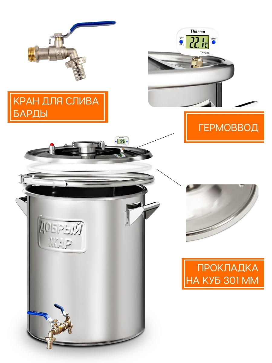 Ферромагнитное дно позволяет использовать перегонный куб на любой нагревательной поверхности: электрической, стеклокерамической, газовой и индукционной. Бак также можно использовать как емкость для брожения, установив в крышку гидрозатвор.