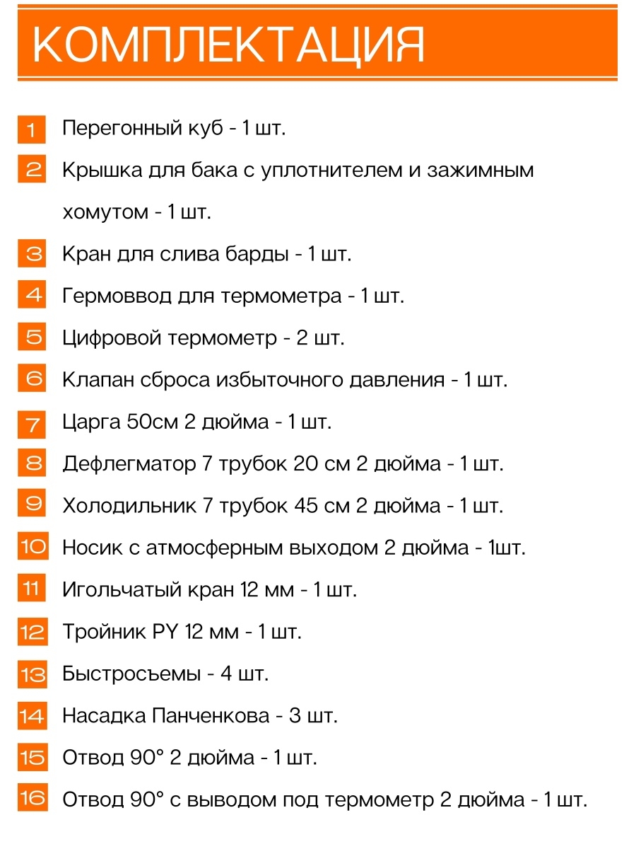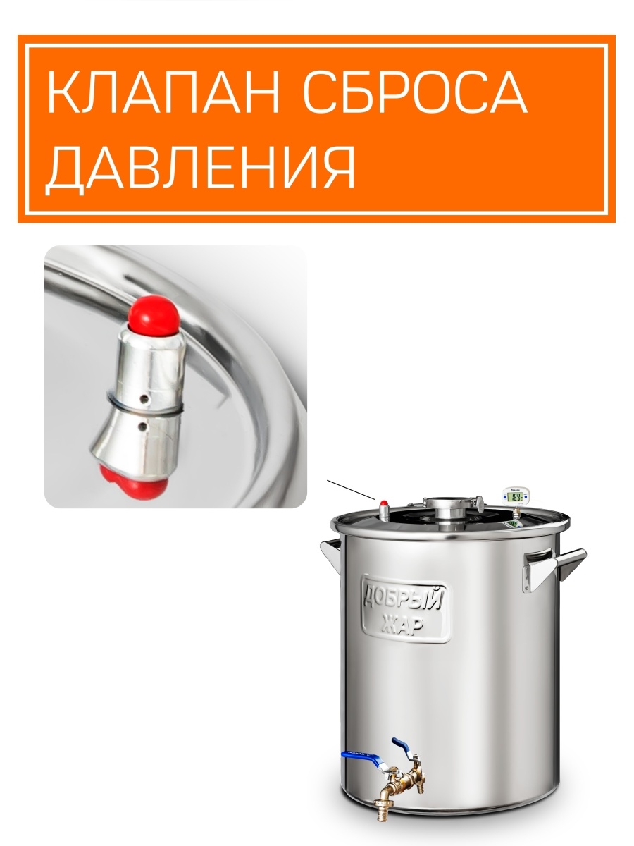 Многофункциональная крышка оборудована клапаном сброса избыточного давления, возникающего в случае неправильной эксплуатации самогонного аппарата. Кламповое соединение диаметром в 2 дюйма предназначено для расширения базовой комплектации аппарата. Крышка надежна крепится на перегонном кубе при помощи герметичного зажимного хомута, не позволяющего лишним запахам выбраться наружу.