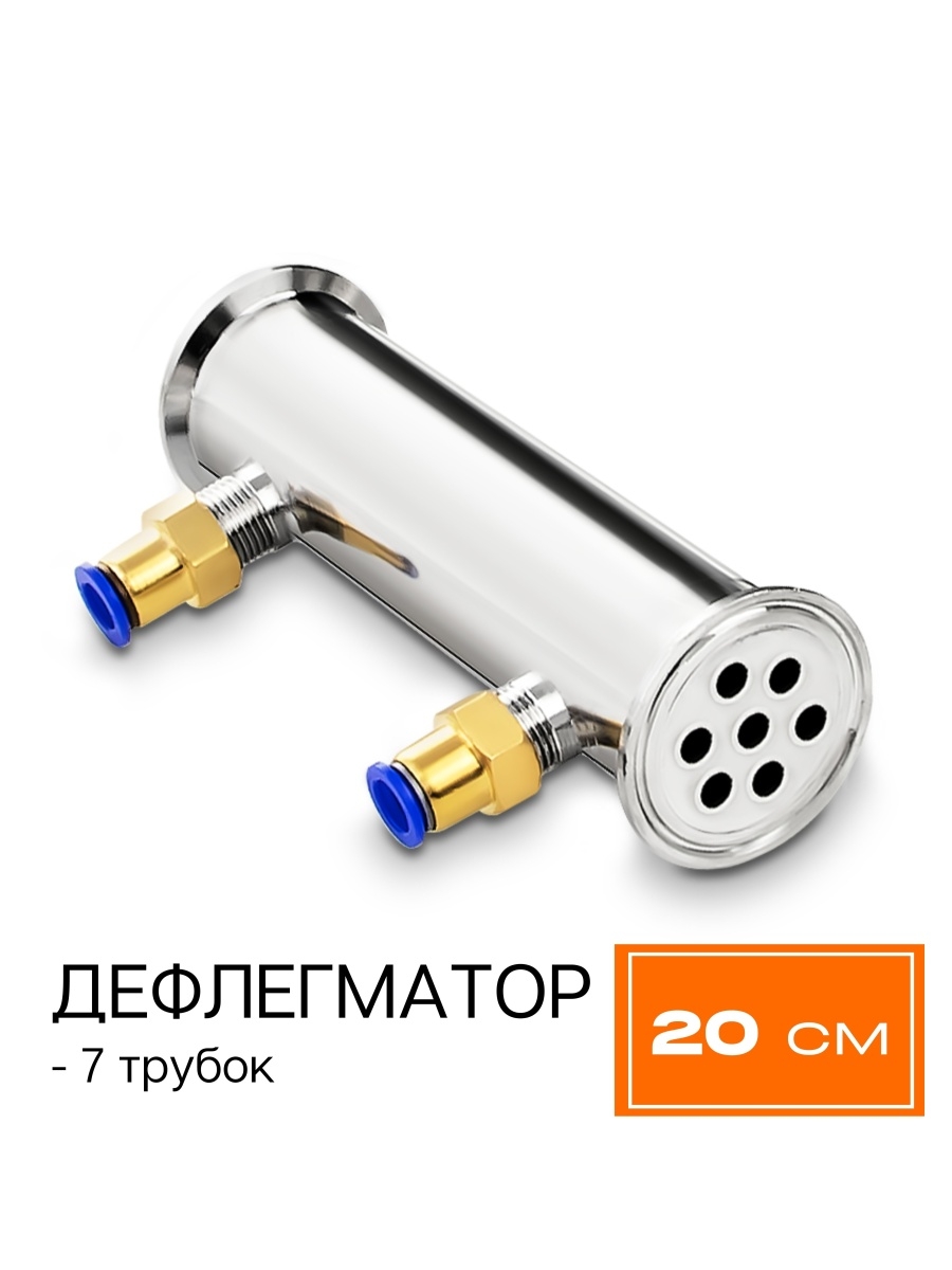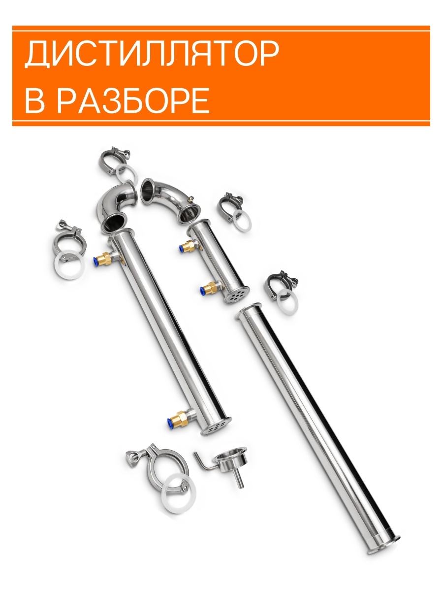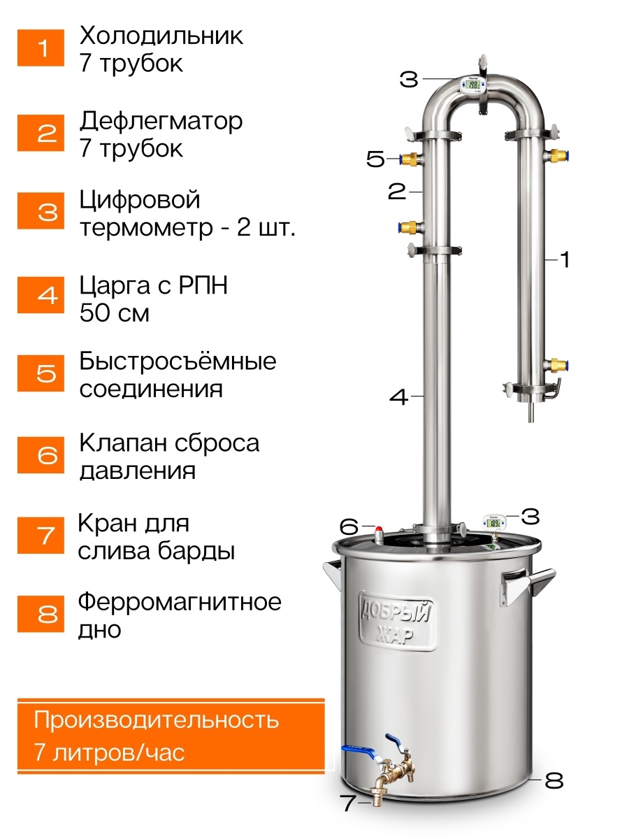 Колонна состоит из кожухотрубного холодильника и дефлегматора. Внутри расположено семь трубок диаметром 10 мм. За счет этого колонна обладает высокой производительностью и способна работать при мощности нагрева свыше 5 кВт, выдавая до 7 литров готового продукта в час и обеспечивая моментальную конденсацию пара.