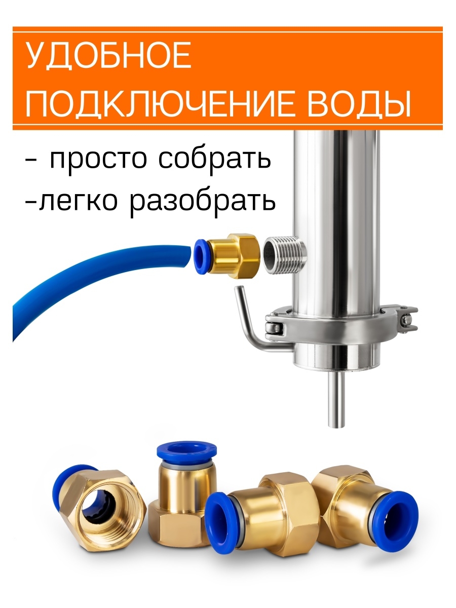 Самогонный аппарат «Абсолют» оснащён специальными фитинговыми зажимами (быстросъемами), с их помощью легко подключить и отключать от холодильника шланги подачи и отвода воды, что обеспечивает комфорт в эксплуатации и сборке аппарата.