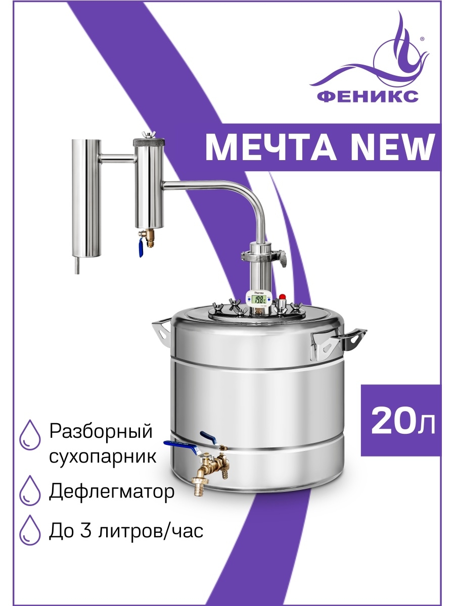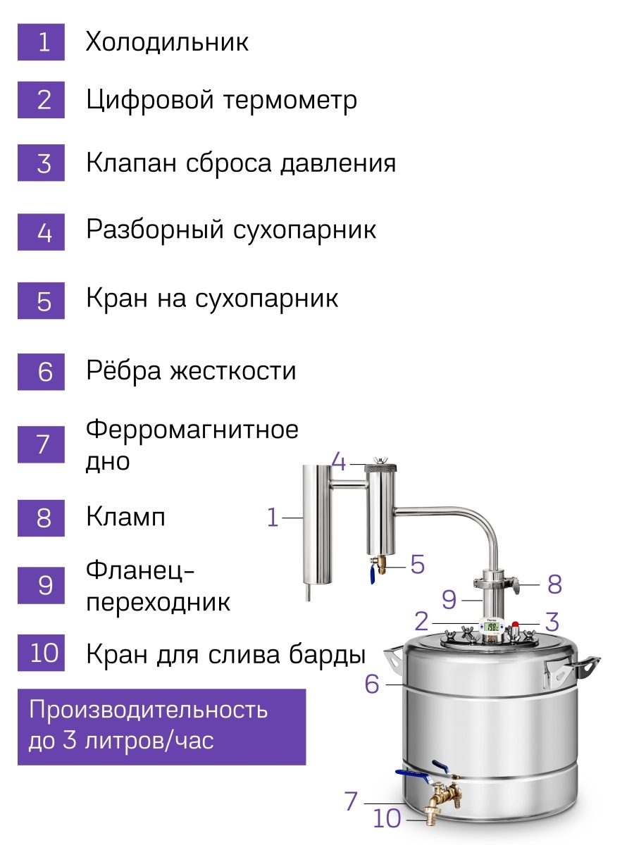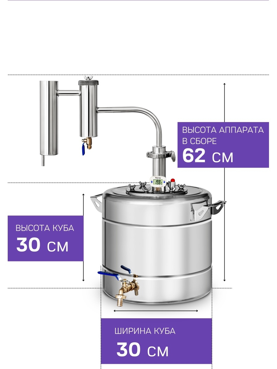 Самый компактный самогонный аппарат! Разборный сухопарник оснащен краном для слива сивушного масла, а увеличенный холодильник способен утилизировать пар на 30% быстрее. На смену биметаллическому термометру пришел электронный, а значит, что точность измерений стала выше. Этот простой в конструкции, но надежный дистиллятор помещается между плитой и вытяжкой, не занимая много места на кухне и обеспечивая комфортное использование. Вы приготовите крепкий, ароматный и экологически чистый напиток, который займет почетное место на вашем столе