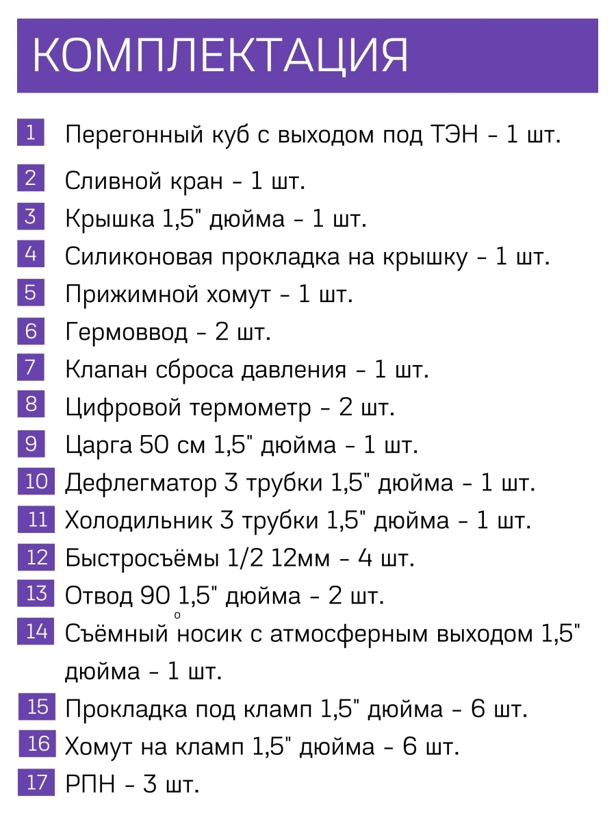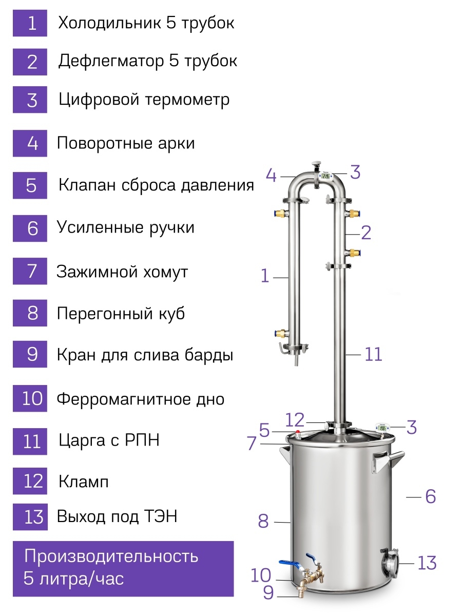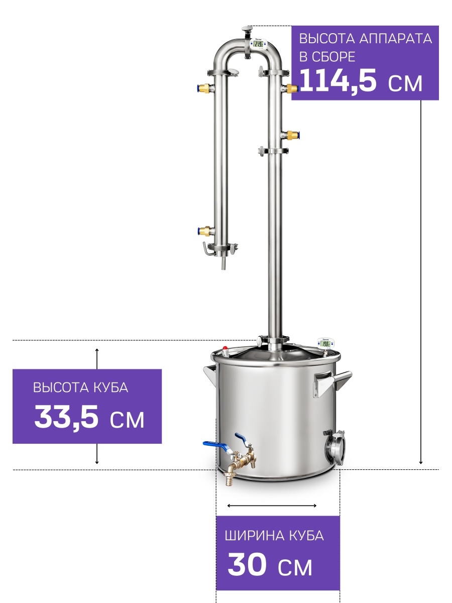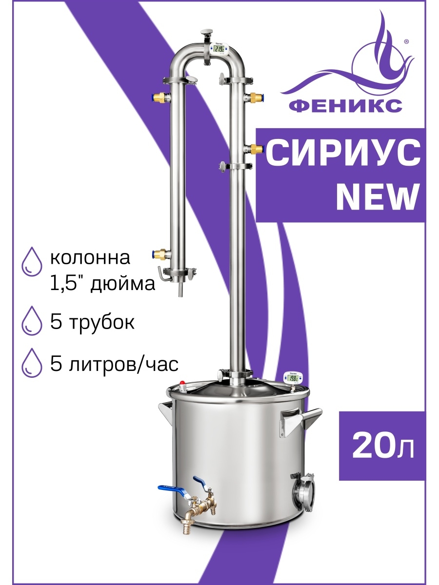Это новая, модернизированная версия любимого вами аппарата «Сириус». Мы усовершенствовали систему охлаждения, увеличив диаметр трубок в холодильнике и дефлегматоре. Добавили фитинг-зажимы для фиксации ПВХ шлангов и заменили силиконовую прокладку бака. «Сириус NEW» – наша звезда зажглась по-новому!
