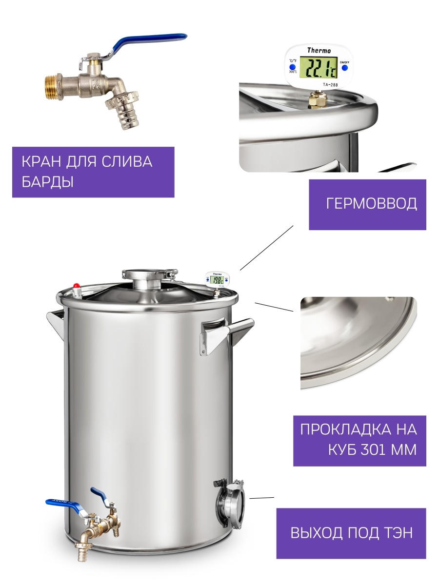 Бак аппарата, как и все его элементы, сделаны из жаропрочной стали марки AISI 304/430 устойчивой к ржавчине и механическим деформациям. Перегонный куб оснащен всем необходимым для комфортного и безопасного использования: