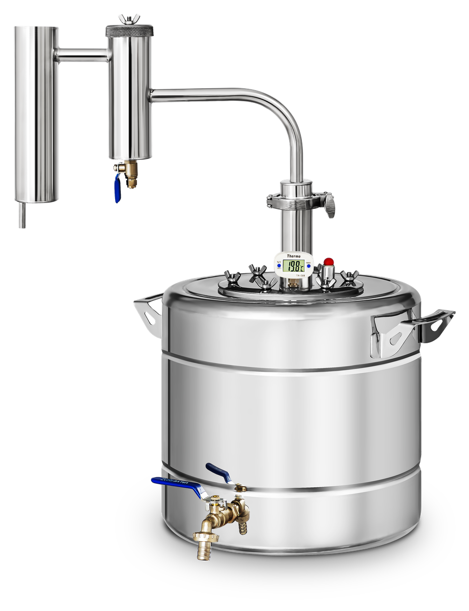 Самый компактный самогонный аппарат! Разборный сухопарник оснащен краном для слива сивушного масла, а увеличенный холодильник способен утилизировать пар на 30% быстрее. На смену биметаллическому термометру пришел электронный, а значит, что точность измерений стала выше. Этот простой в конструкции, но надежный дистиллятор помещается между плитой и вытяжкой, не занимая много места на кухне и обеспечивая комфортное использование. Вы приготовите крепкий, ароматный и экологически чистый напиток, который займет почетное место на вашем столе