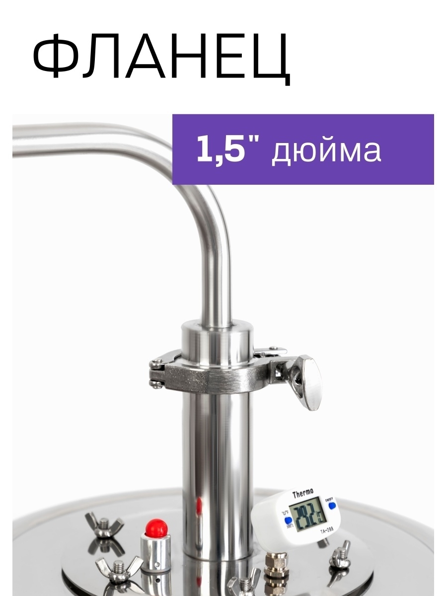 Перегонный куб с фланцевым соединением – это классический вариант перегонного куба. Диаметр горловины 11,5 см – этого достаточно для удобного доступа внутрь аппарата для его очистки после дистилляции. Ребра жесткости не позволяют баку деформироваться при эксплуатации и транспортировке аппарата, что сохранит первоначальный внешний вид изделия в течение долгого времени. Преимущество фланцевого крепления – практичность и удобство сборки. Достаточно установить «голову» аппарата на бак и зафиксировать ее с помощью 6 стальных барашков. За герметичность соединения отвечает прокладка из пищевого силикона. Второе преимущество – демократичная стоимость. Термометр и клапан сброса давления установлены не на перегонном кубе, а на фланце дистиллятора. Если вы решите докупить бак большего или меньшего объема, то это обойдется дешевле.