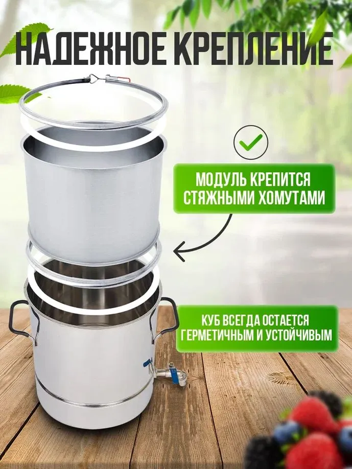 Дополнительный модуль, увеличивающий объём куба дистиллятора Helicon Органик 2 на 10 л. Позволяет расширить стандартную ёмкость для больших партий браги.