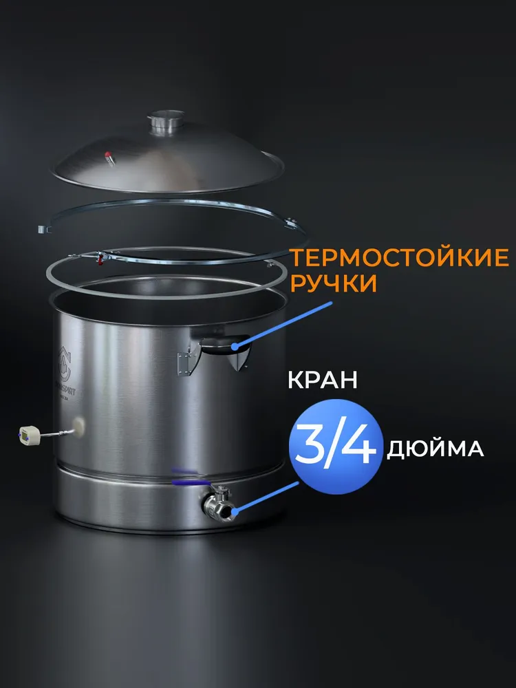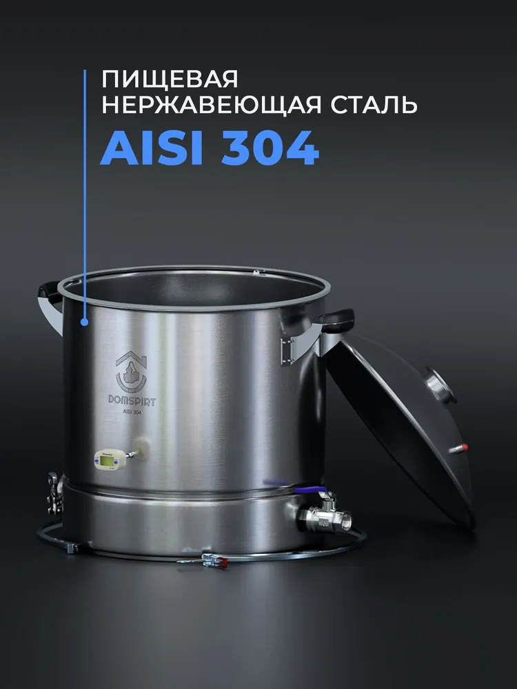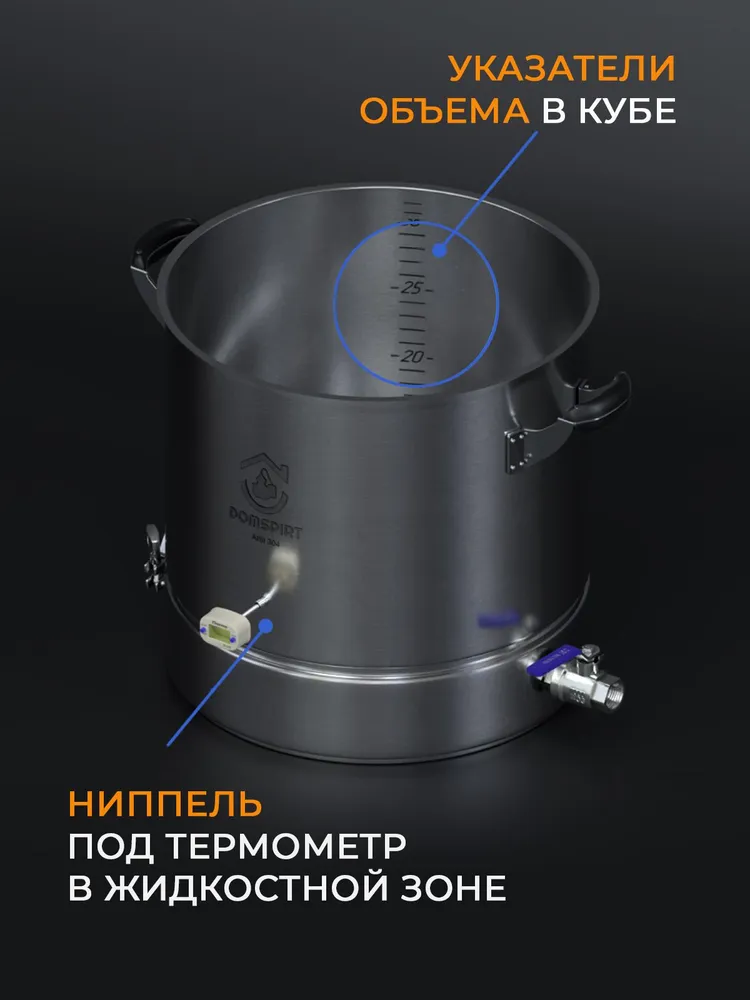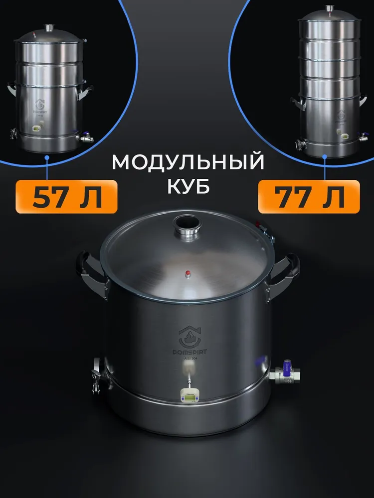 Перегонный куб DomSpirt 2 с объемом 37 литров — это современное и удобное устройство для самогоноварения и пивоварения. Универсальный выход под кламп диаметром 2 дюйма позволяет подключать любые колонны соответствующего стандарта, а модульная конструкция дает возможность увеличивать объем куба до 57 или даже 77 литров.