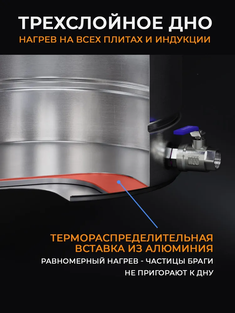 - Удобство использования. Сливной кран диаметром ¾ дюйма исключает необходимость поднимать горячий куб для слива браги.