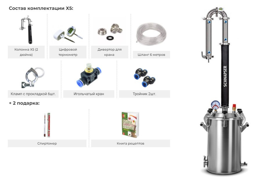 Колонна Schnapser X5 позволяет приготовить в домашних условиях любой напиток. Коньяк, виски, ром, чача, бренди, джин, абсент, самогон - это лишь малая часть возможностей X5.