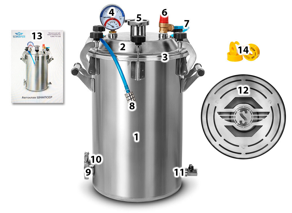 Автоклав Шнапсер способен работать как на воде (при полностью заполненном баке водой), так и на пару (когда бак заливается на 1-2 литра), благодаря фальш-дну на ножках.