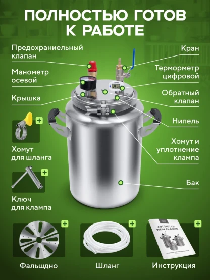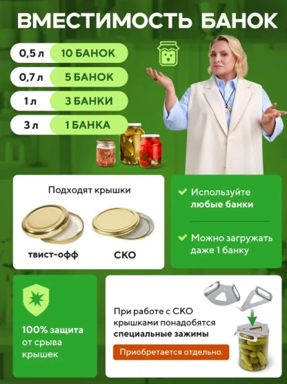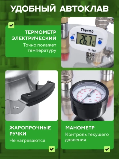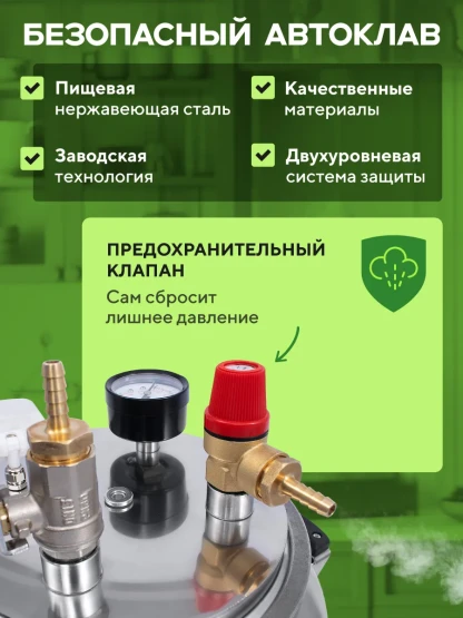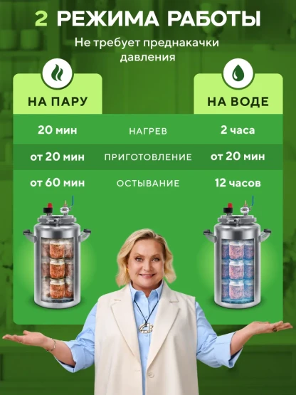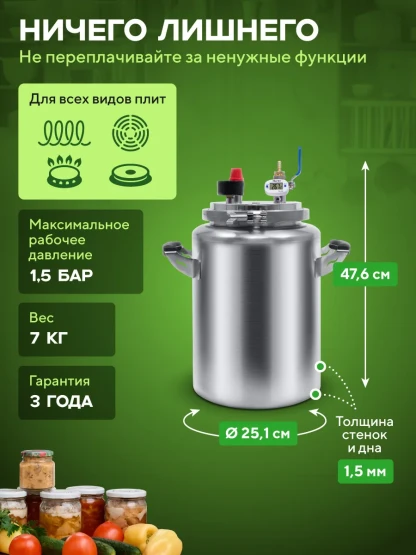 Классический автоклав для домашнего консервирования с простым и безопасным управлением. Устройство предназначено для приготовления различных видов консервов с сохранением питательных свойств продуктов.