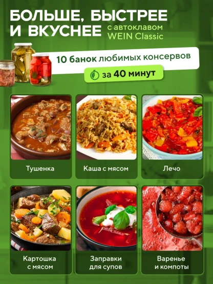 Автоклав Wein Classic представляет собой надежное решение для домашнего консервирования, сочетающее простоту использования с профессиональными характеристиками. Устройство обеспечивает безопасное приготовление мясных, рыбных, овощных консервов и других продуктов благодаря продуманной системе клапанов и прочной конструкции из нержавеющей стали. Технология быстрой фиксации крышки и отсутствие необходимости в предварительной накачке давления делают процесс консервирования доступным даже для начинающих пользователей.