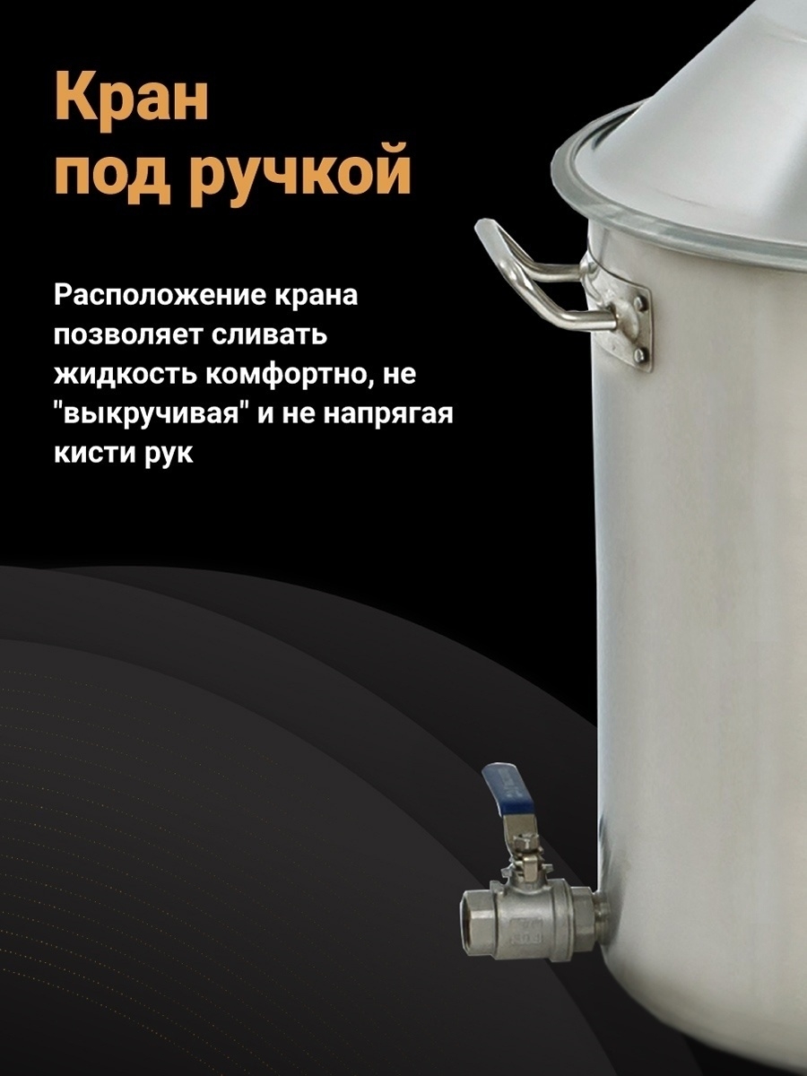 - Кран под ручкой. Расположение крана позволяет сливать жидкость комфортно, не "выкручивая" и не напрягая кисти рук