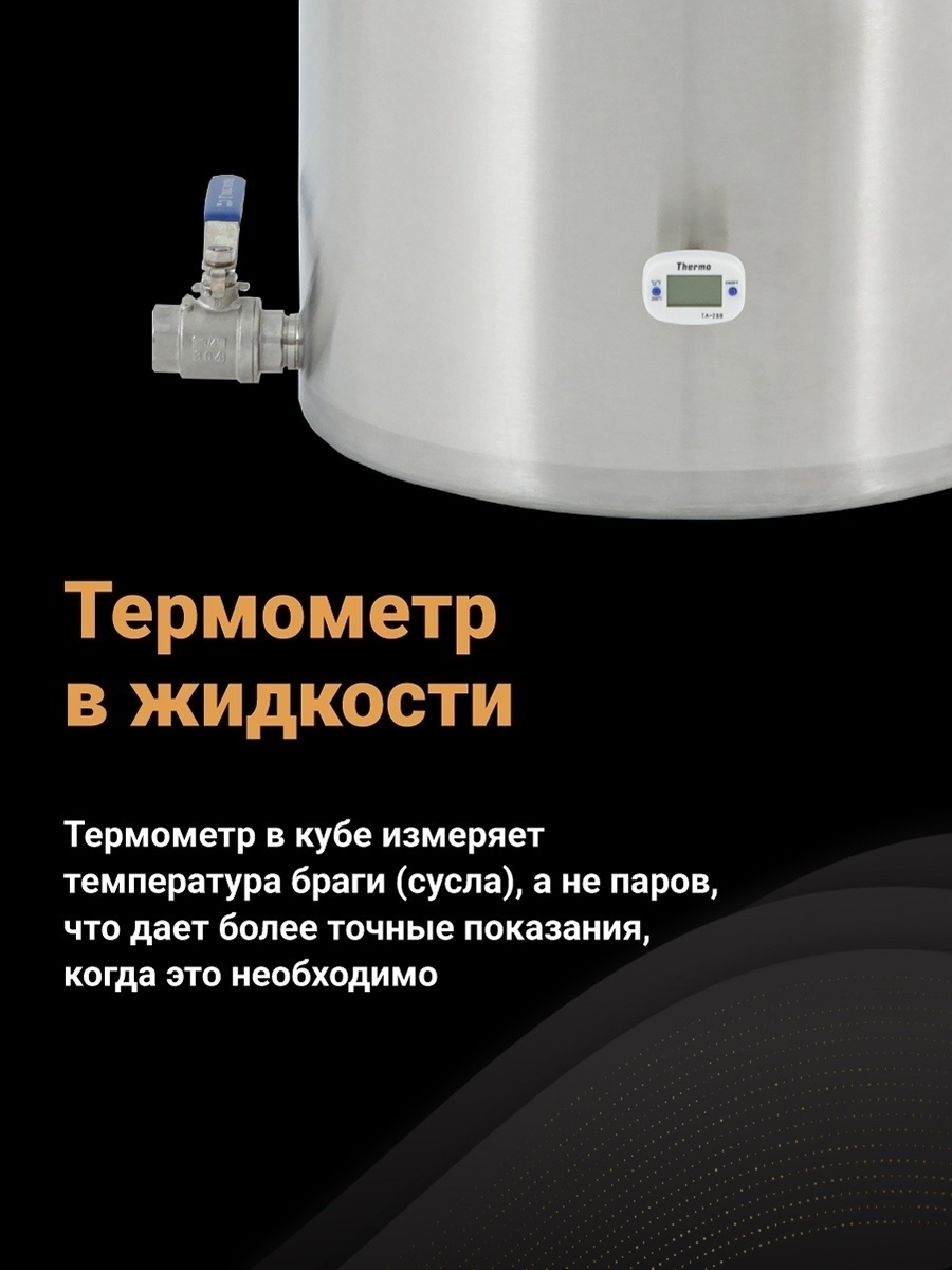 - Термометр в жидкости. Термометр в кубе измеряет температура браги (сусла), а не паров, что дает более точные показания, когда это необходимо