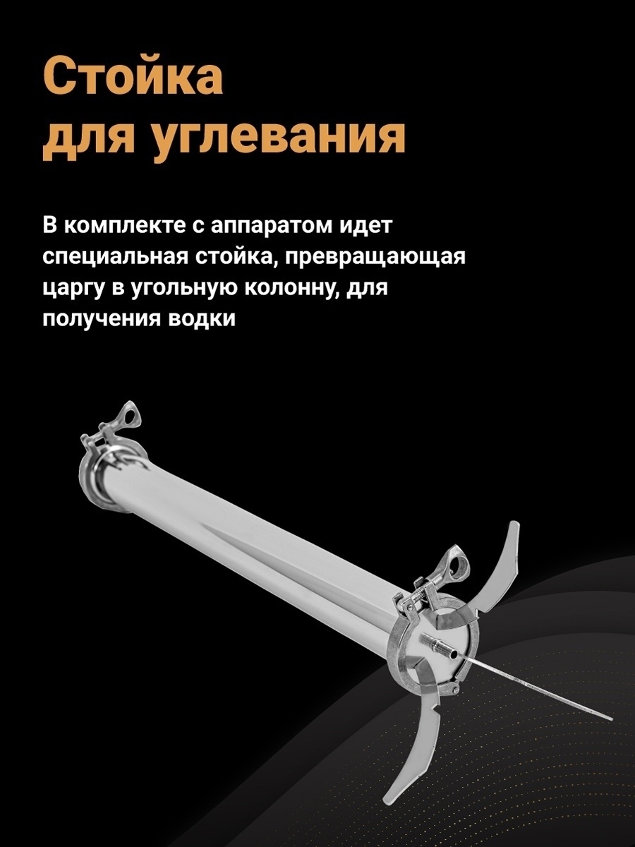 - Стойка для углевания. В комплекте с аппаратом идет специальная стойка, превращающая царгу в угольную колонну, для получения водки