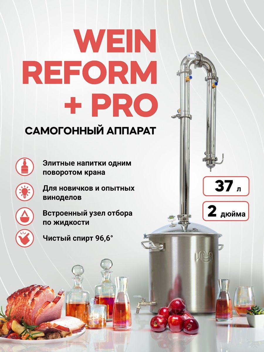 Самогонный аппарат Wein (Вейн) ReForm + PRO мощный 2-дюймовый аппарат для выполнения всего спектра задач по приготовлению домашних напитков. Преимущество аппарата - встроенный жидкостный узел отбора. Он стабилизирует перегонку и облегчает отбор фракций. Его особенности: Позволяет легко получать спирт максимальной крепости 96,6 г, упрощает получение ароматных дистиллятов, требует минимального контроля и настроек во время перегонки, обеспечивает высокую скорость и эффективность, исключает потери продукта, экономит воду и электроэнергию, дает возможность поставить автоматику. В комплект товара входят мощный холодильник с 3D охлаждением, длинная царга 50см, в которую помещается 5 насадок (сеток) Панченкова, клапан сброса давления, который защищает от взрыва при избыточном давлении. Литражная разметка в кубе Аппарат произведен из пищевой нержавеющей стали AISI304.Толщина стенок 0,8 мм, тощина дна - 5мм Работает на всех типах плит.