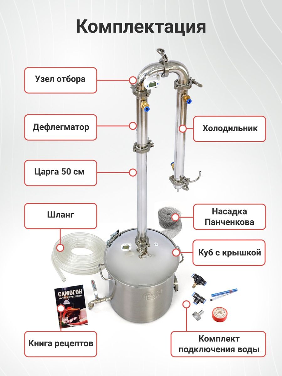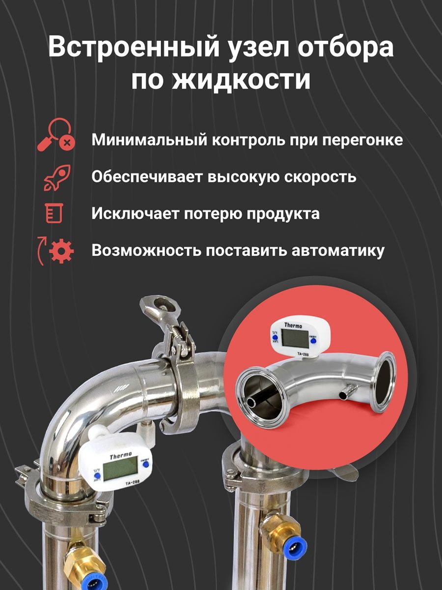Встроенный узел жидкостный узел отбора — «сердце» аппарата. Он стабилизирует перегонку и облегчает отбор фракций. Кроме того, он имеет массу других преимуществ для винокура: