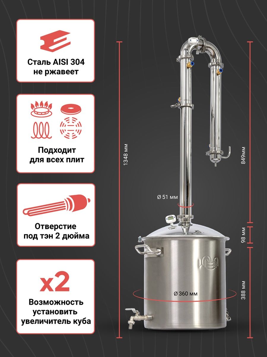 Это самые популярные объемы среди тех, кто выбирает аппарат “для себя”. В “промышленных” объемах могут пригодиться кубы больших литражей, но для домашнего винокура один из этих вариантов станет идеальным. Рекомендуем 37-литровый куб - он сочетается со стандартной бродильной ёмкости.