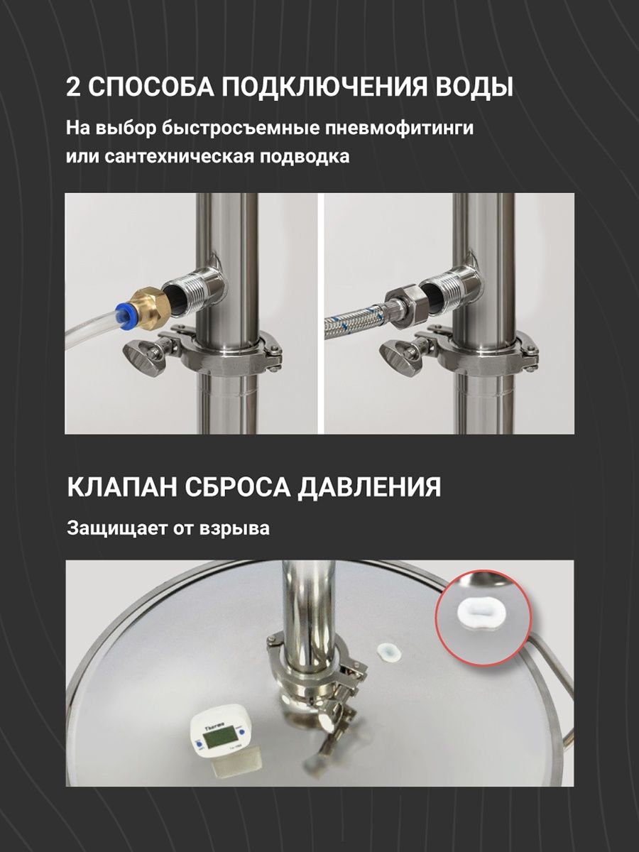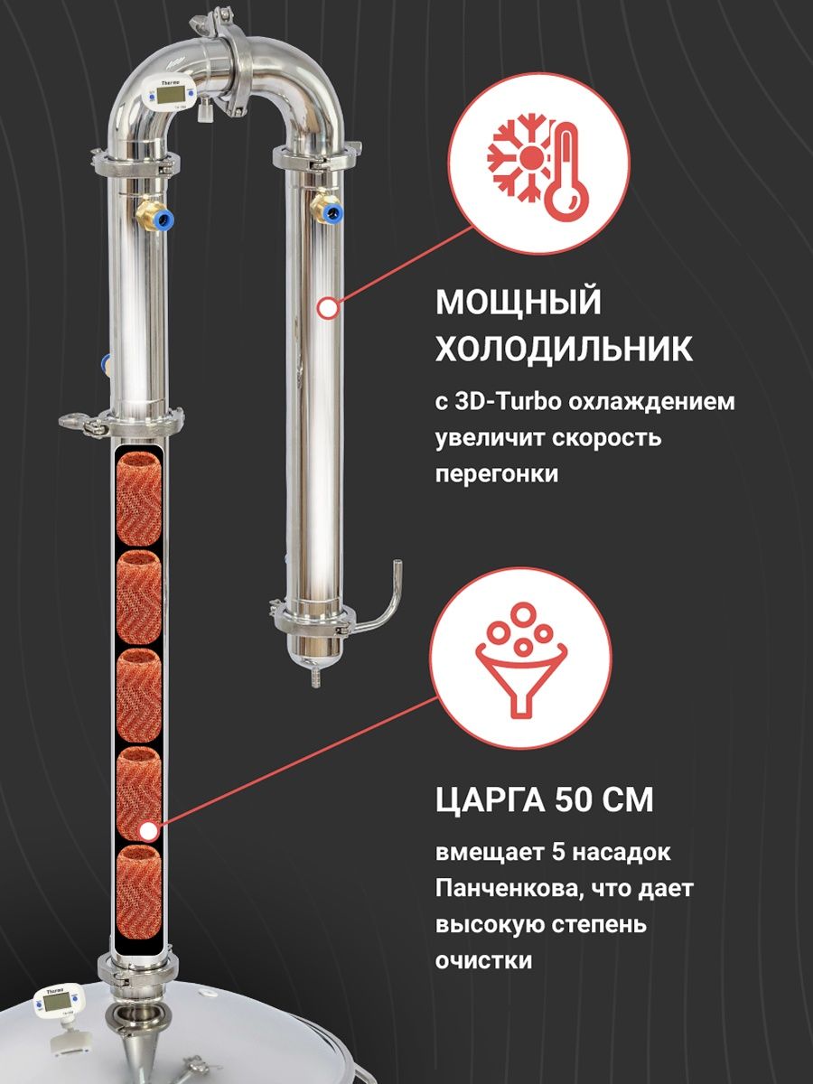 В холодильнике и дефлегматоре обычные перегородки заменены на специальные, распределяющие поток воды по всему объему в 5 направлениях. Это гарантирует равномерное и качественное охлаждение - расход воды меньше, а эффективность и мощность охлаждения выше.