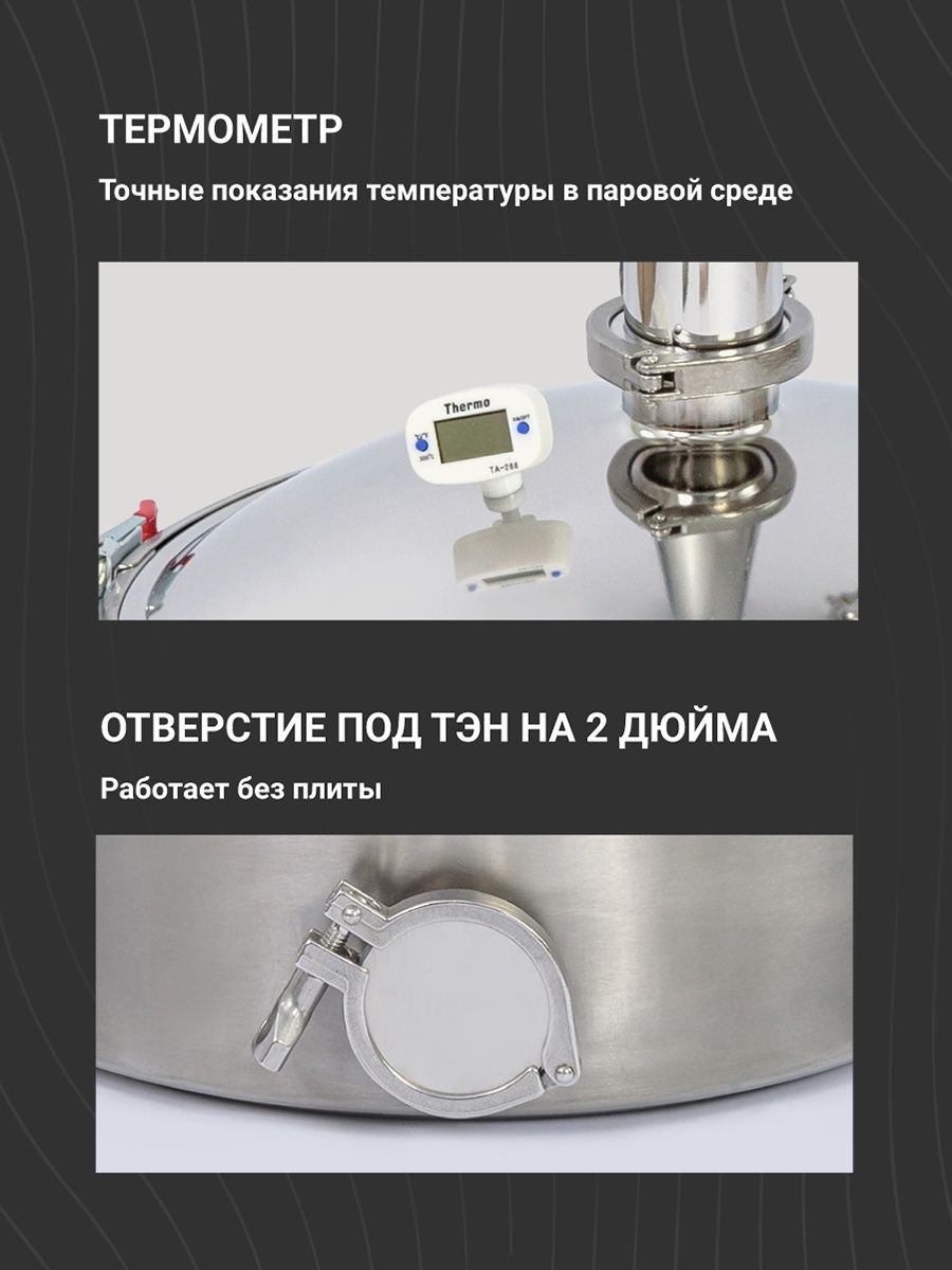 Никаких гильз и прочих приспособлений — щуп термометра в Wein ReForm+ находится непосредственно внутри куба в паровой среде, обеспечивая точные показания термометра.