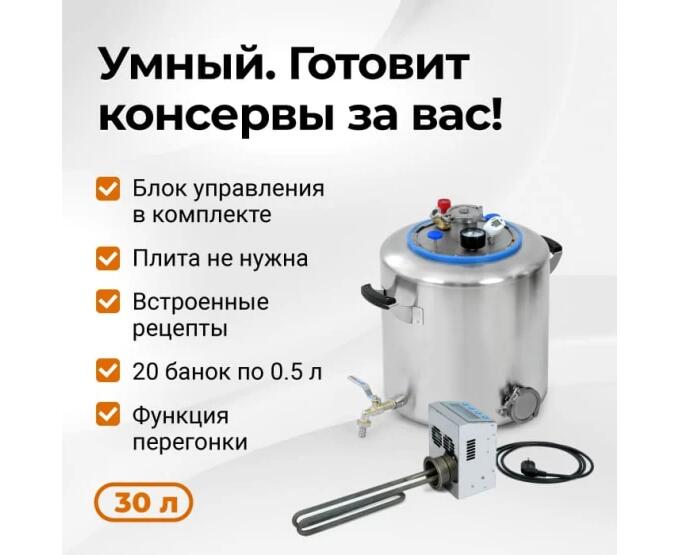 Современный автоматизированный автоклав увеличенного объема для домашнего консервирования и приготовления продуктов. Устройство сочетает передовые технологии управления с профессиональными характеристиками, обеспечивая максимальное удобство использования.