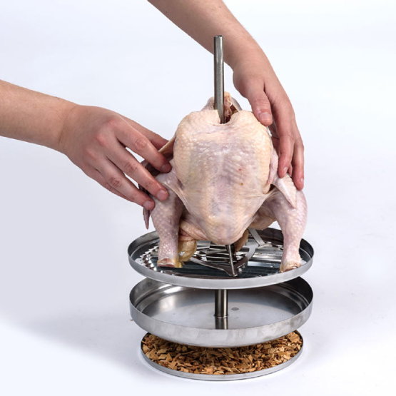 - Возможность коптить цельные куриные тушки благодаря новой насадке. Промываете тушку, насаживаете ее на насадку и коптите. Все просто и удобно.
