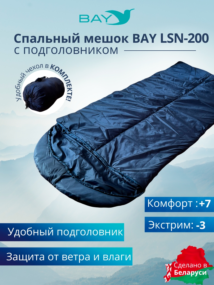 Спальный мешок Bay-LSN-200 -3 (75x230) с подголовником. Практичная модель для летнего и демисезонного отдыха на природе. Разъемные молнии позволяют объединить два спальных мешка в один двойной. Можно расстегнуть молнию и использовать спальник как обыкновенное одеяло.