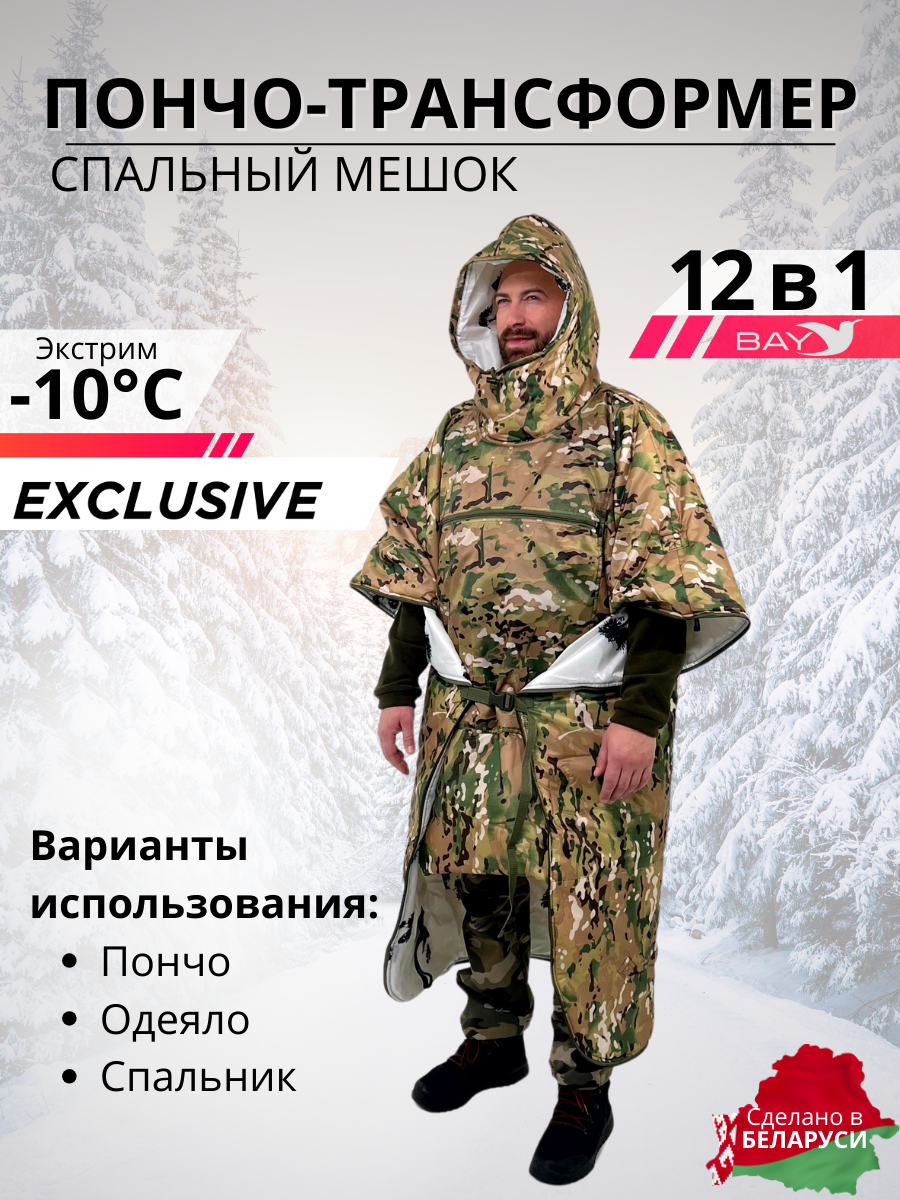 Пончо-трансформер 12 в 1 легко складывается и занимает мало места. Вы можете носить его как одежду, использовать как спальник, одеяло, мешок, подушку, навес, гамак, кокон, носилки или волокушу. Всего 12 вариантов использования в одном изделии!