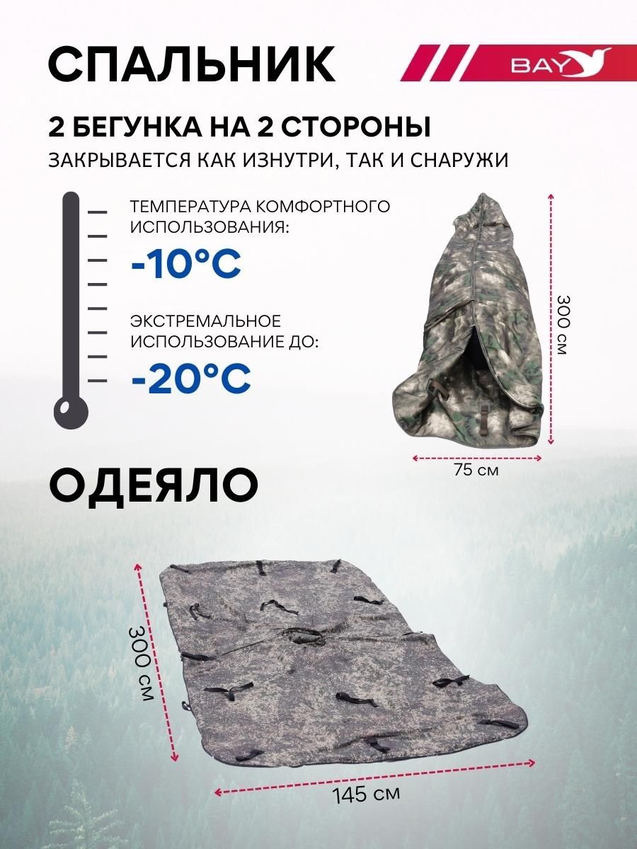 3. Спальник 3м*0.75см, 2 бегунка на 2 стороны, закрывается как изнутри, так и снаружи. Температурные режимы: • Комфорт: 0*С • Экстрим: - 10*
