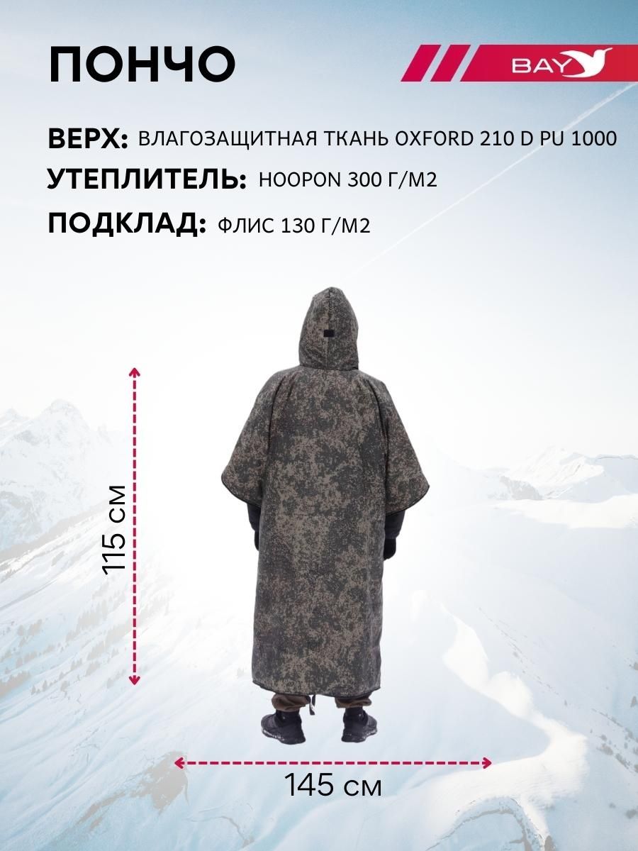 1. Пончо влагозащитный утепленный. Высота от плеч до низа изделия- 115 см. Ширина по плечам 145 см.