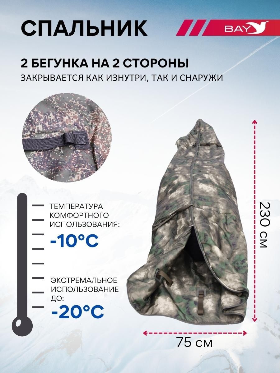 2. Спальник 2,3м*0.75см, 2 бегунка на 2 стороны, закрывается как изнутри, так и снаружи. Температура комфортного использования: -10*С, экстремальное использование: до -20*С.