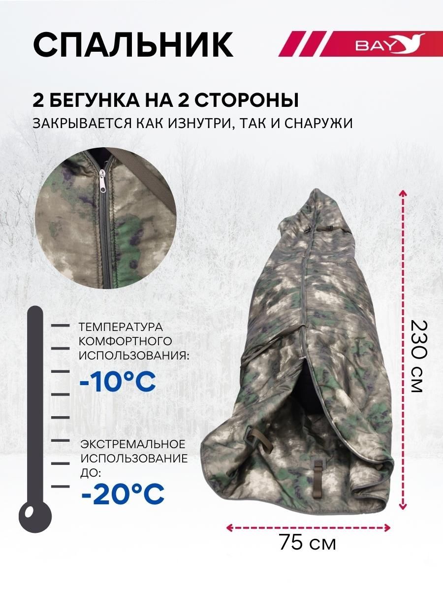 2. Спальник 2,3м*0.75см, 2 бегунка на 2 стороны, закрывается как изнутри, так и снаружи. Температура комфортного использования: -10*С, экстремальное использование: до -20*С.