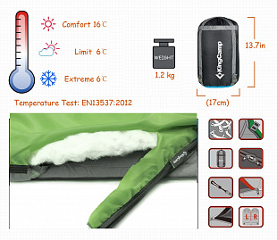 Спальный мешок KingCamp Oasis 200 +6С Назначение: треккинг, кемпинг. Клапан на застежке – «молнии», двусторонняя застежка-«молния», сумка компрессионная для переноски из нейлона.