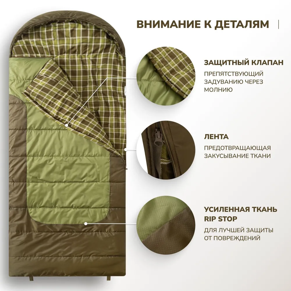 Для защиты от холода предусмотрен утепленный клапан вдоль молнии и усиленное утепление в ножной части. Лента против закусывания ткани молнией упрощает использование спальника.