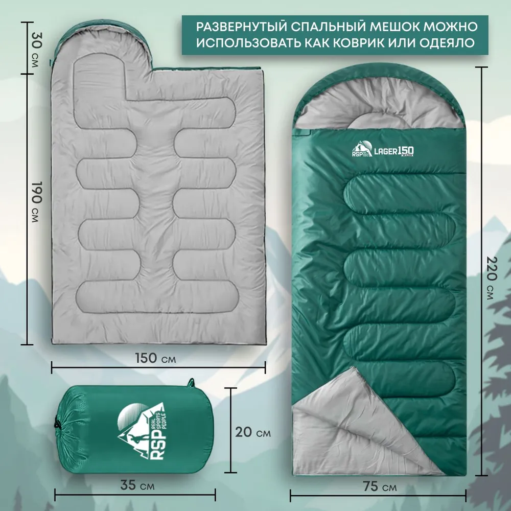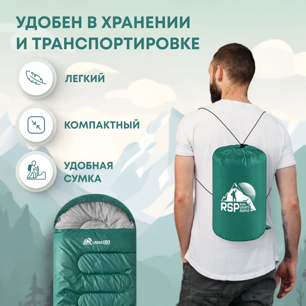 Спальный мешок RSP LAGER 150 зеленый, правая молния - это спальный мешок, предназначенный для использования в условиях умеренного климата. Он изготовлен из прочных и водонепроницаемых материалов, что обеспечивает ему долговечность и защиту от непогоды.