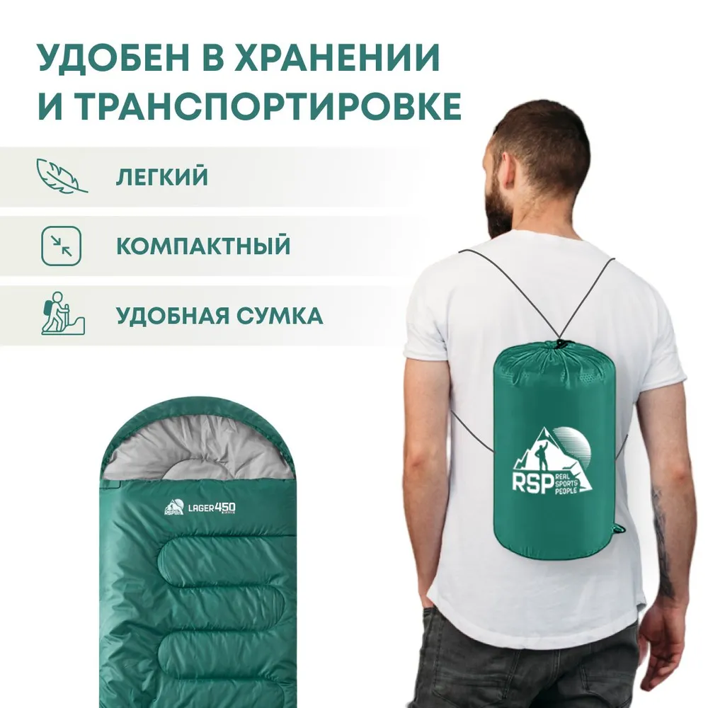 Спальный мешок RSP LAGER 450 зеленый, правая молния - это спальный мешок, предназначенный для использования в условиях умеренного климата. Он изготовлен из прочных и водонепроницаемых материалов, что обеспечивает ему долговечность и защиту от непогоды.