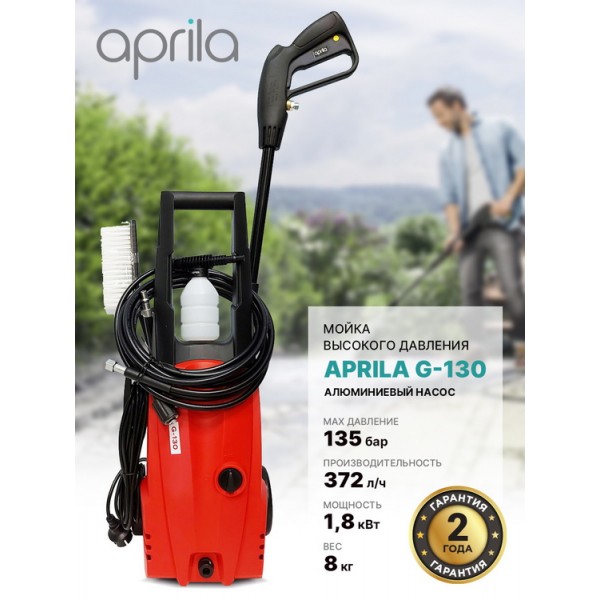 Aprila G-130 — бытовая электрическая мойка высокого давления, предназначенная для эффективной очистки автомобилей, садовых дорожек, фасадов, террас, заборов и другой бытовой инфраструктуры. Надёжна в использовании, подходит как для частых, так и нерегулярных работ.