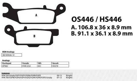 ТОРМОЗНЫЕ КОЛОДКИ ДЛЯ КВАДРОЦИКЛОВ YAMAHA (GRIZZLY 550, 700) RIVAL HS446